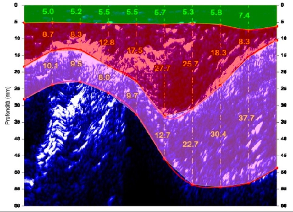 L’adipometro Hosand BX 2000 che utilizzo, scorrendo sulla zona di misura, crea una mappa dei tessuti sottostanti (stratigrafia), sulla quale è possibile: